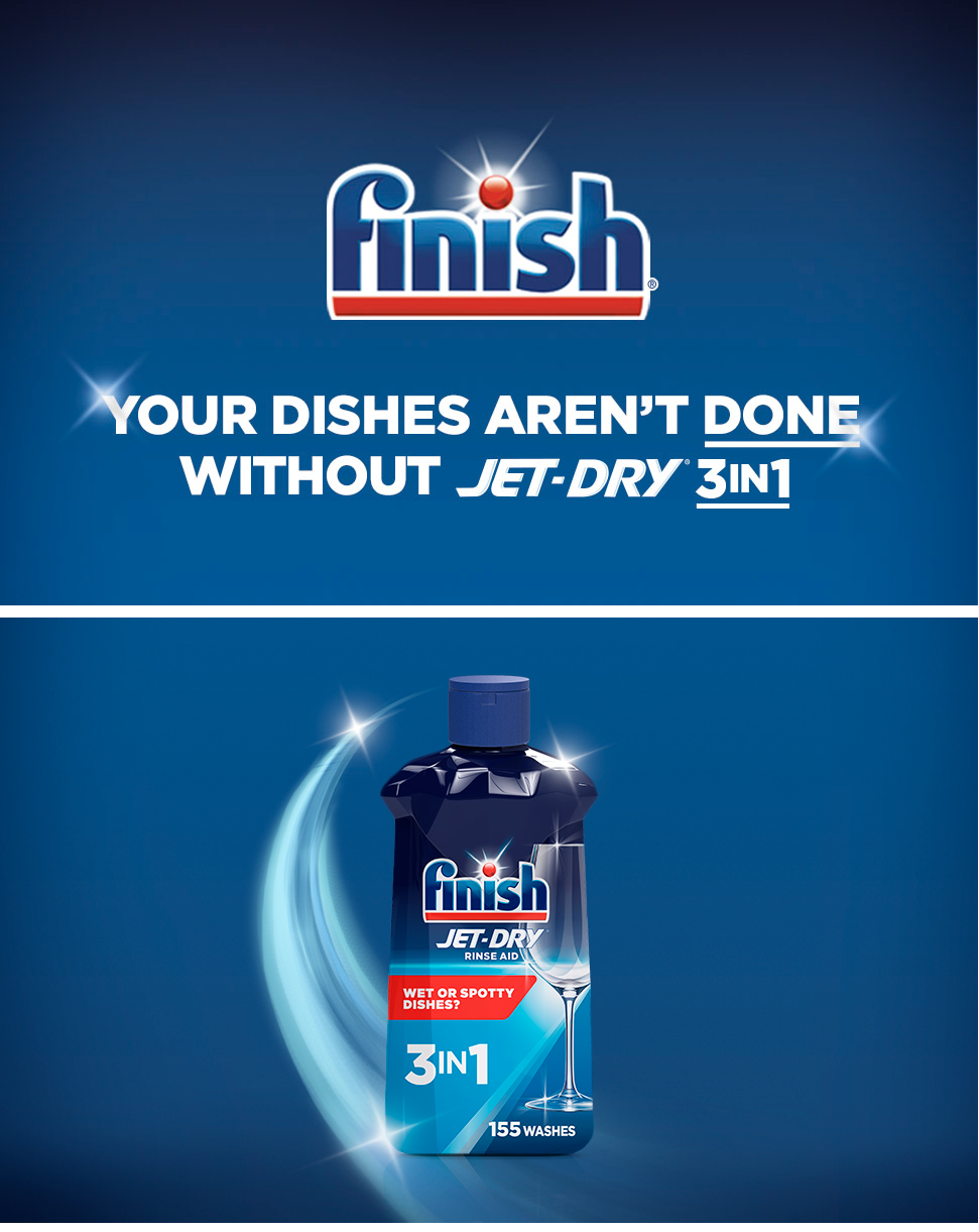 • Simply fill your rinse aid dispenser with Finish Jet-Dry Rinse Aid and it will be automatically released in the rinse cycle every time your dishwasher runs.